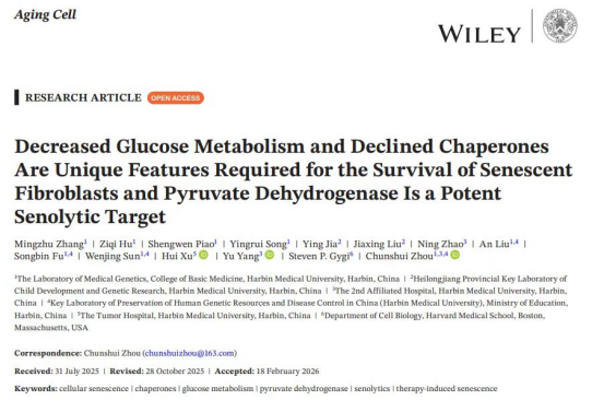 该研究的定量蛋白组学数据采集部分得到了哈佛医学院ThermoFisher多重蛋白组学中心的支持,衰老小鼠模型的机能测试得到了中国工程院张学院士领衔的黑龙江省儿童发育与遗传重点实验室的大力帮助。该研究以“Decreased Glucose Metabolism and Declined Chaperones Are Unique Features Required for the Survival of Senescent Fibroblasts and Pyruvate Dehydrogenase Is a Potent Senolytic Target”为题目发表在2026年3月的《Aging Cell》杂志上。